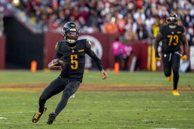Jayden Daniels rifled a spiral between two defenders, hitting a diving Zach Ertz in the hands for a game-winning score against the Atlanta Falcons in overtime, clinching a playoff berth for the Washington Commanders.
